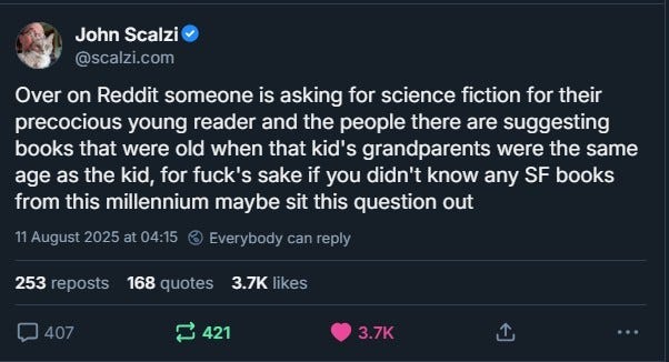 (I still haven’t worked out alt text here but its a bluesky screenshot of the author John Scalzi saying the following: “Over on Reddit someone is asking for science fiction for their precocious young reader and there there are suggesting books that were old when that kid’s grandparents were the same age as the kid, for fuck’s sake if you don’t know any SF books from this millennium maybe sit this question out”)